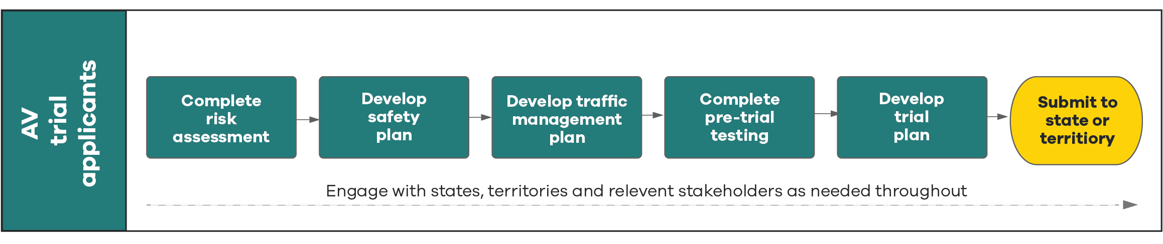 Keep in contact with the state or territory road transport agency as you complete the below steps. You may also work with additional stakeholders, for example your technology or research partners.